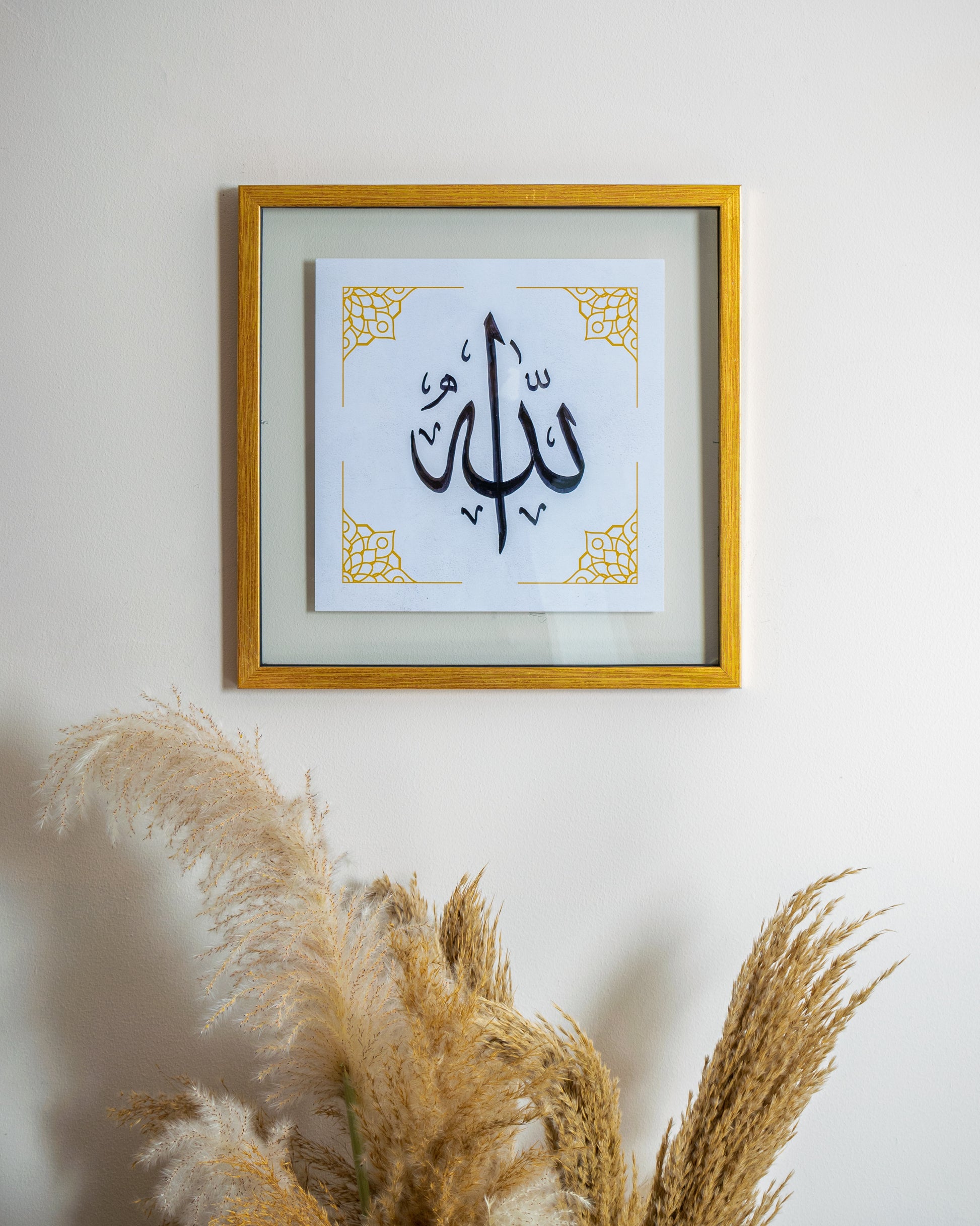 Featuring the name of Allah in beautifully hand-drawn Arabic calligraphy. Set against a minimalist white background with intricate golden corner patterns, this frame adds a spiritual and artistic touch to any room. Perfect for living rooms, prayer corners, or as a thoughtful gift.