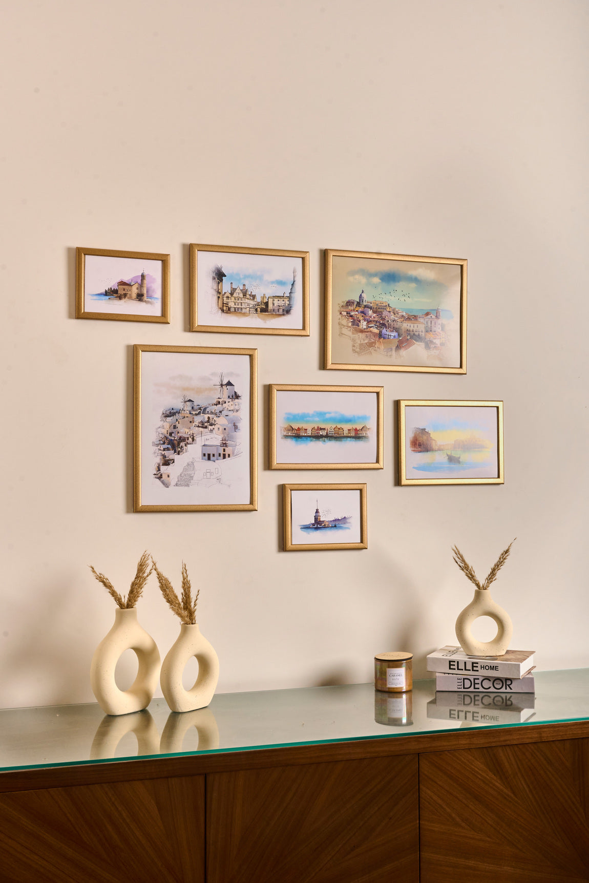 This vibrant wall art collection features seven framed watercolor prints of iconic global destinations, including picturesque coastal towns, historic architecture, and charming European streetscapes. Accented with sleek golden frames, these travel-inspired artworks bring a warm, artistic flair to any room—perfect for wanderlust lovers and home décor enthusiasts