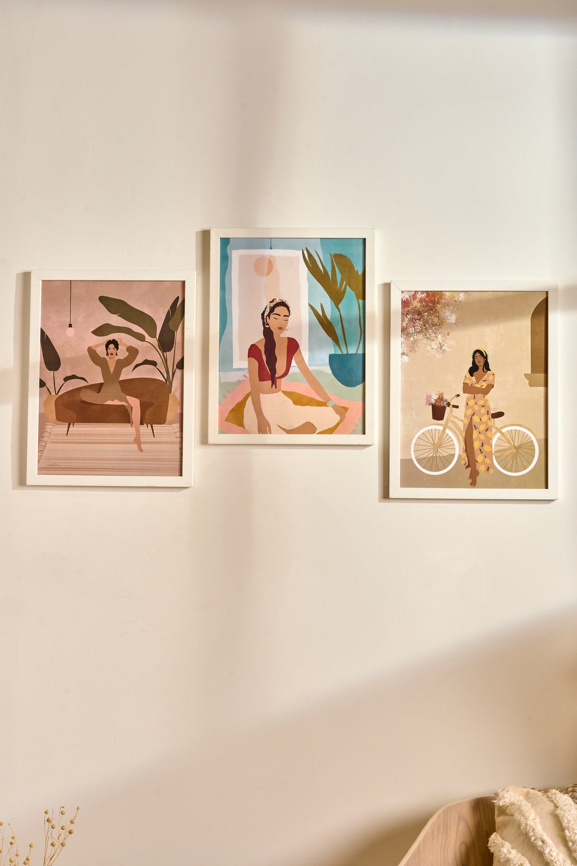 This charming wall art set features three modern illustrations of women in relaxed, everyday moments—lounging, meditating, and enjoying a sunny day with a bicycle. Framed in sleek white, these prints radiate warmth, femininity, and self-expression, making them perfect for boho interiors, bedrooms, or creative studio spaces.