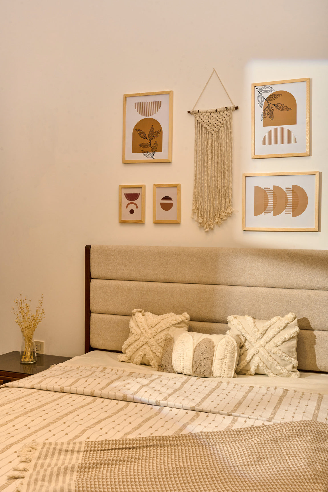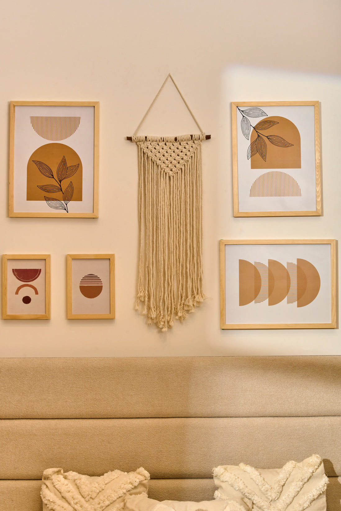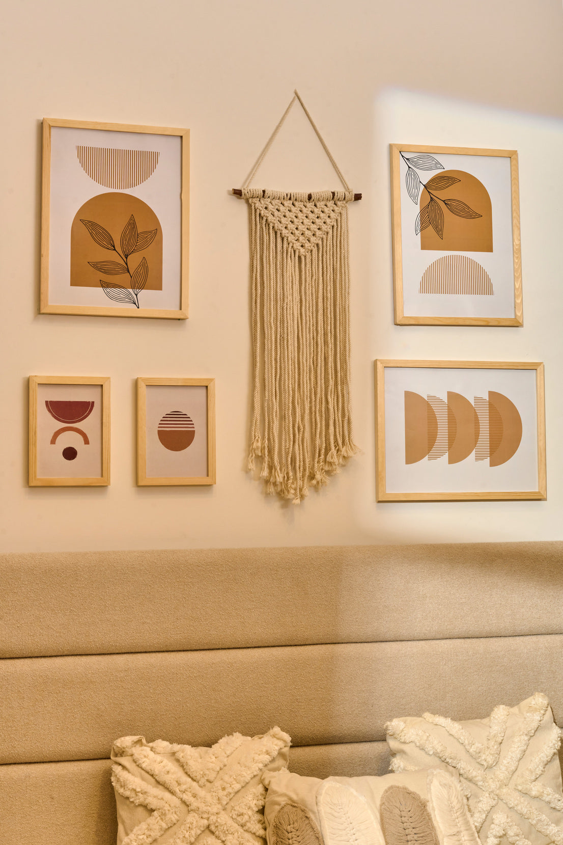 This earthy wall art set features five minimalist boho prints in warm terracotta tones, with abstract shapes and botanical elements, this collection is perfect for boho bedrooms, cozy living rooms, or modern rustic interiors. (Macramé not included)