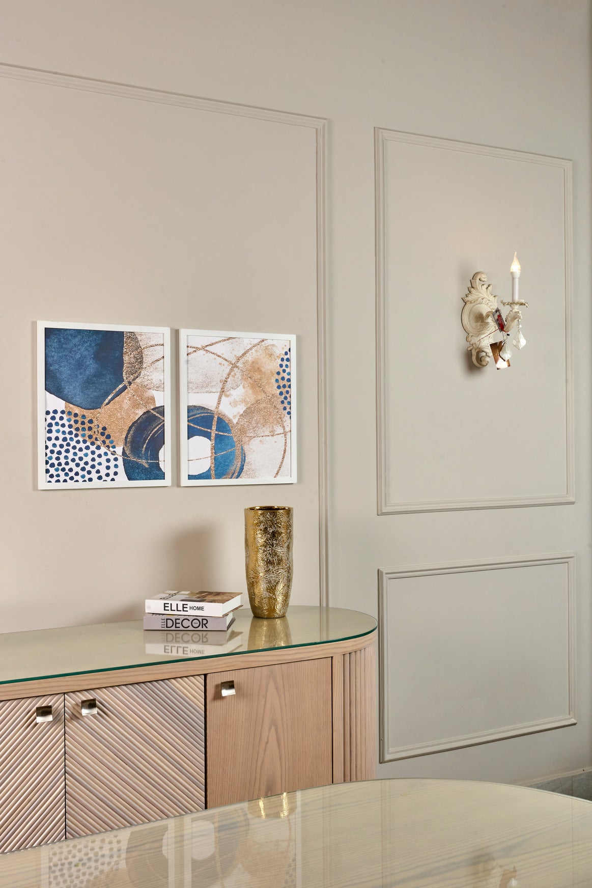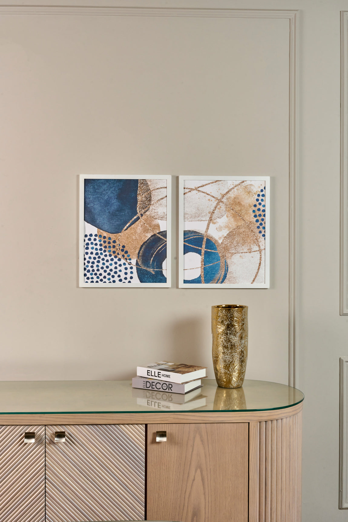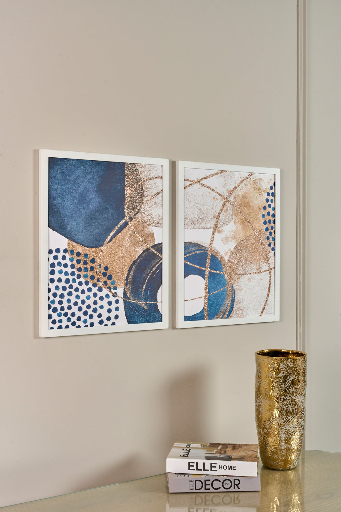 Enhance your home with these modern blue and gold abstract wall art prints. Featuring bold circles and metallic accents, framed in white and ready to hang—perfect for living rooms, bedrooms, and offices.
