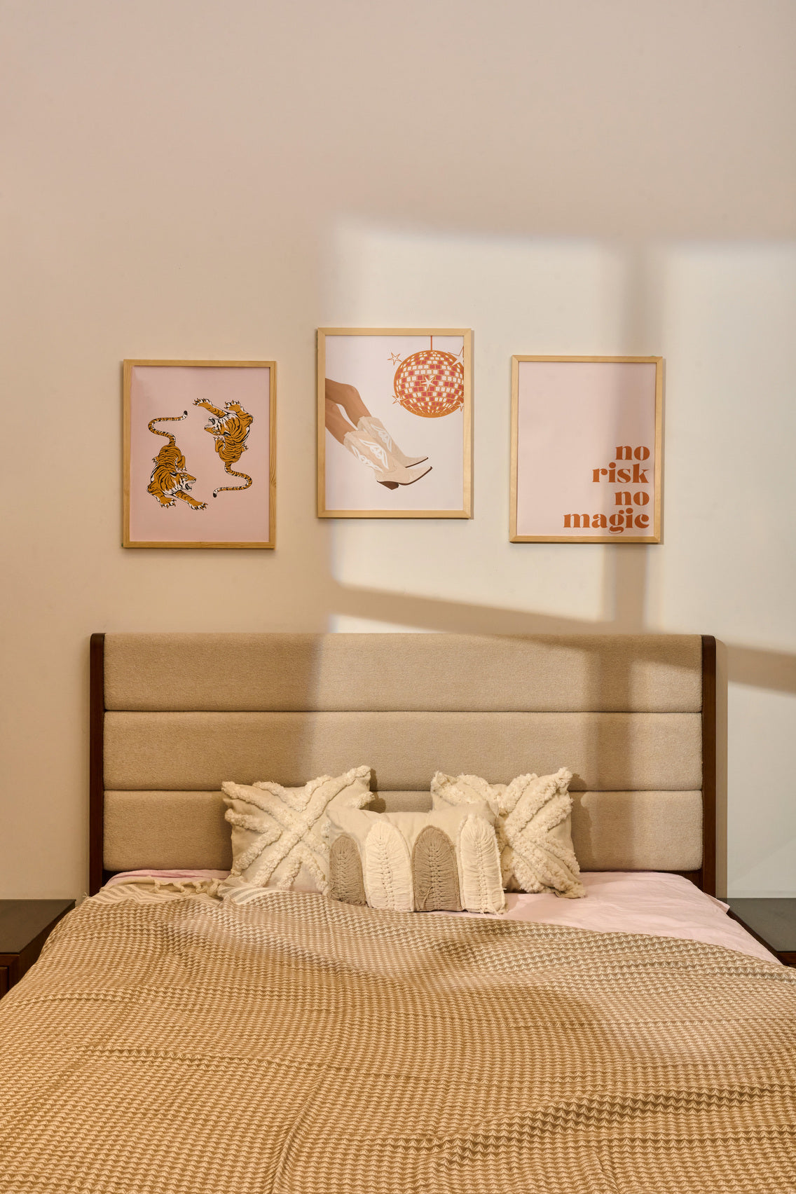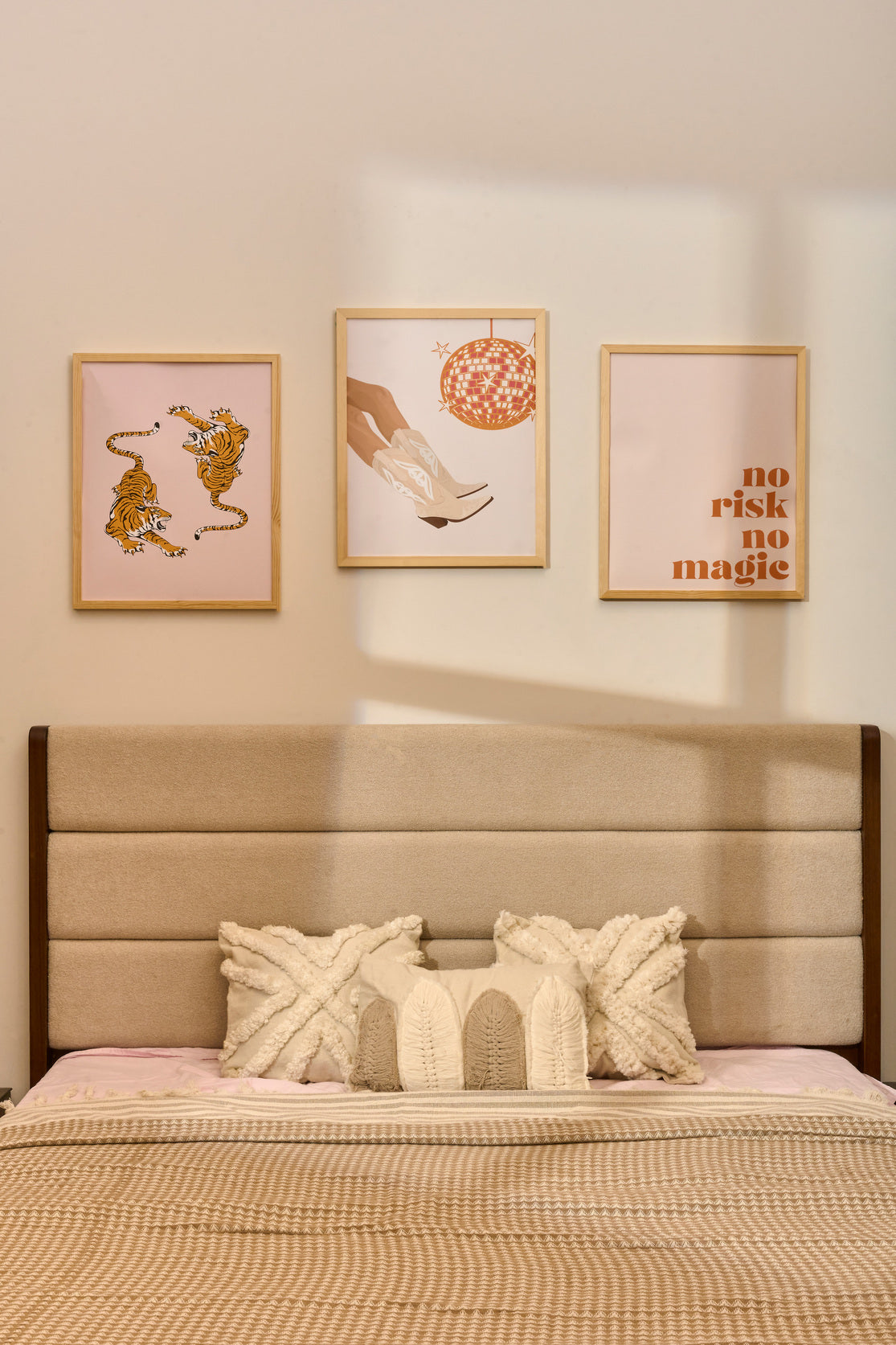 This stylish wall art trio features a modern Western vibe with fierce tiger illustrations, a chic cowgirl boot and disco ball design, and a bold "no risk no magic" quote. Set in light wooden frames with warm pink and orange tones, this set is perfect for boho bedrooms, glam spaces, or eclectic gallery walls.