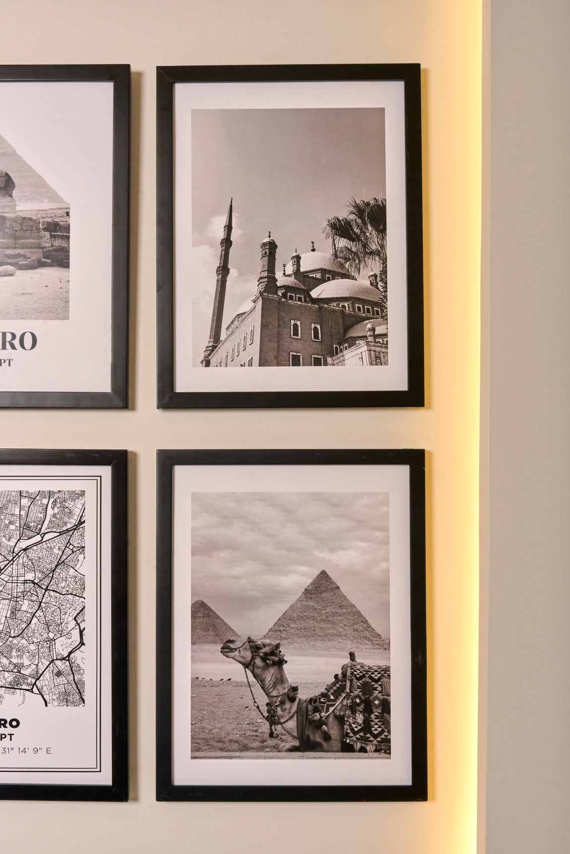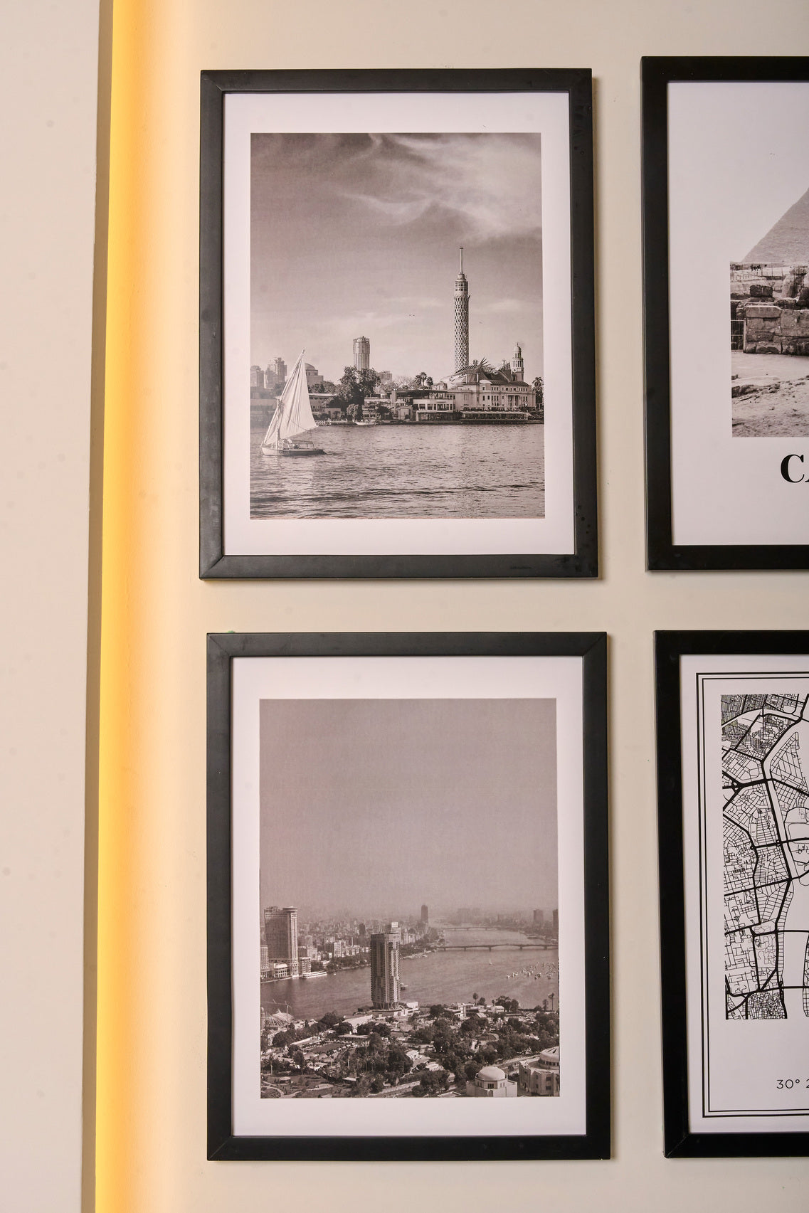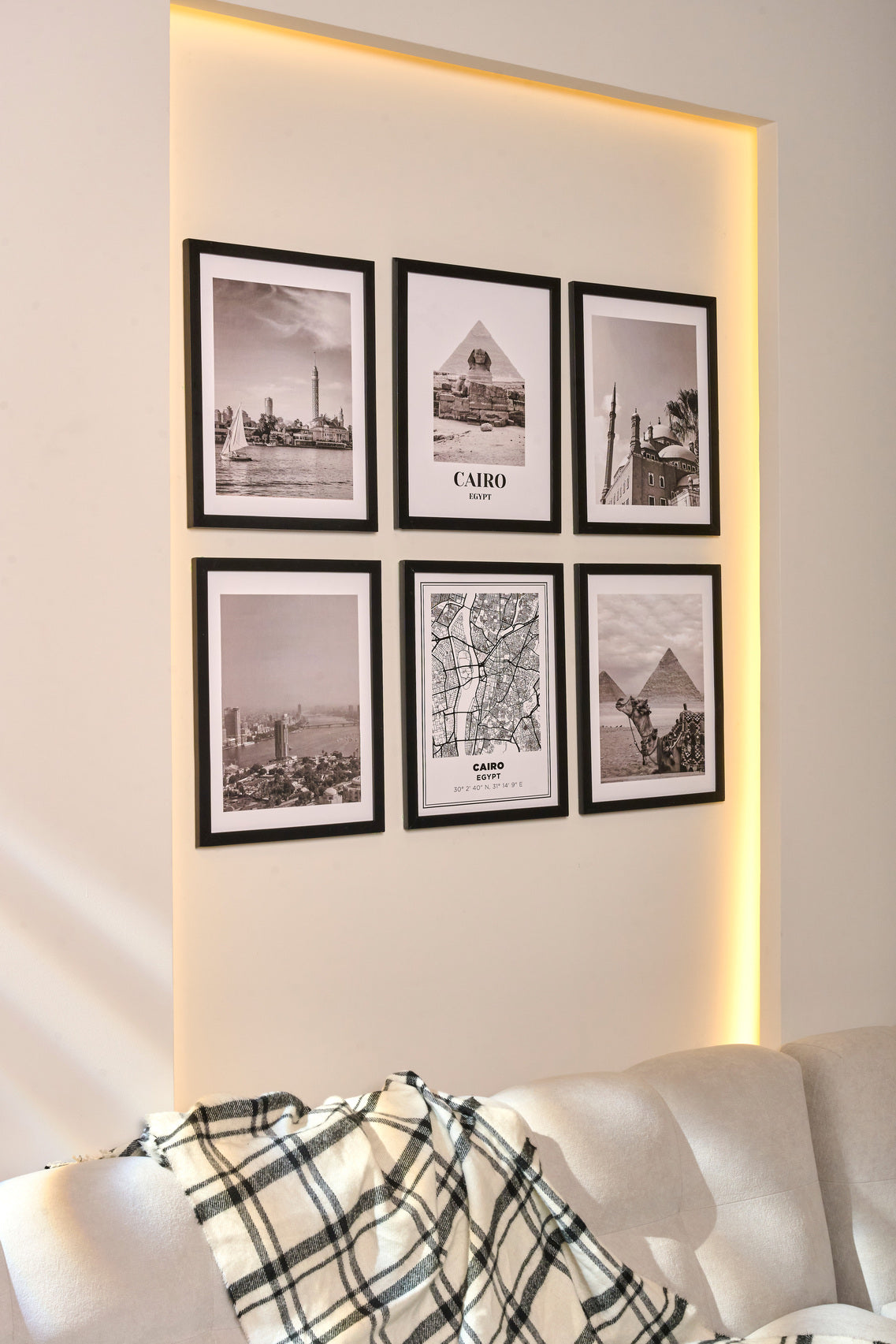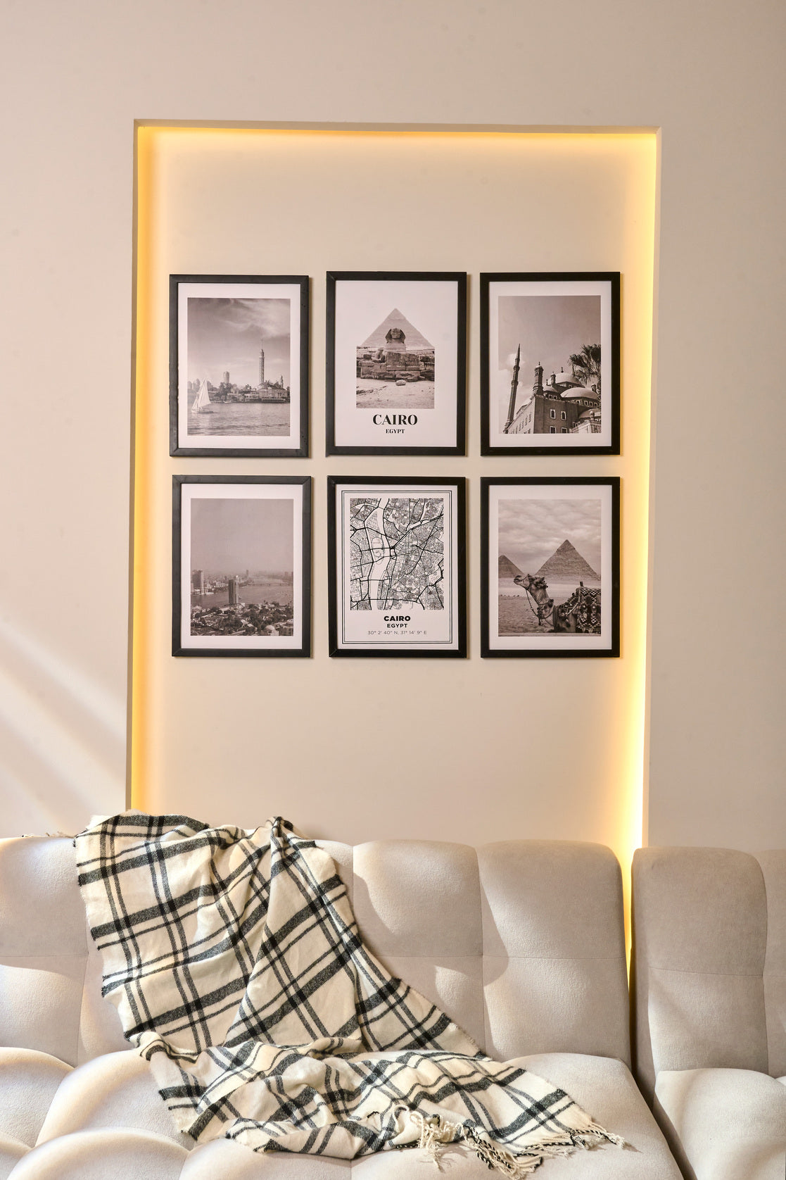 This elegant wall art set features six black-and-white framed prints showcasing iconic landmarks and maps of Cairo, Egypt. Highlighting scenes such as the majestic pyramids, historic mosques, and vintage cityscapes, this gallery-style arrangement adds a sophisticated, cultural touch to any room. Perfect for travel lovers and décor enthusiasts, this Cairo photo frame set blends history and art in a timeless monochrome palette.