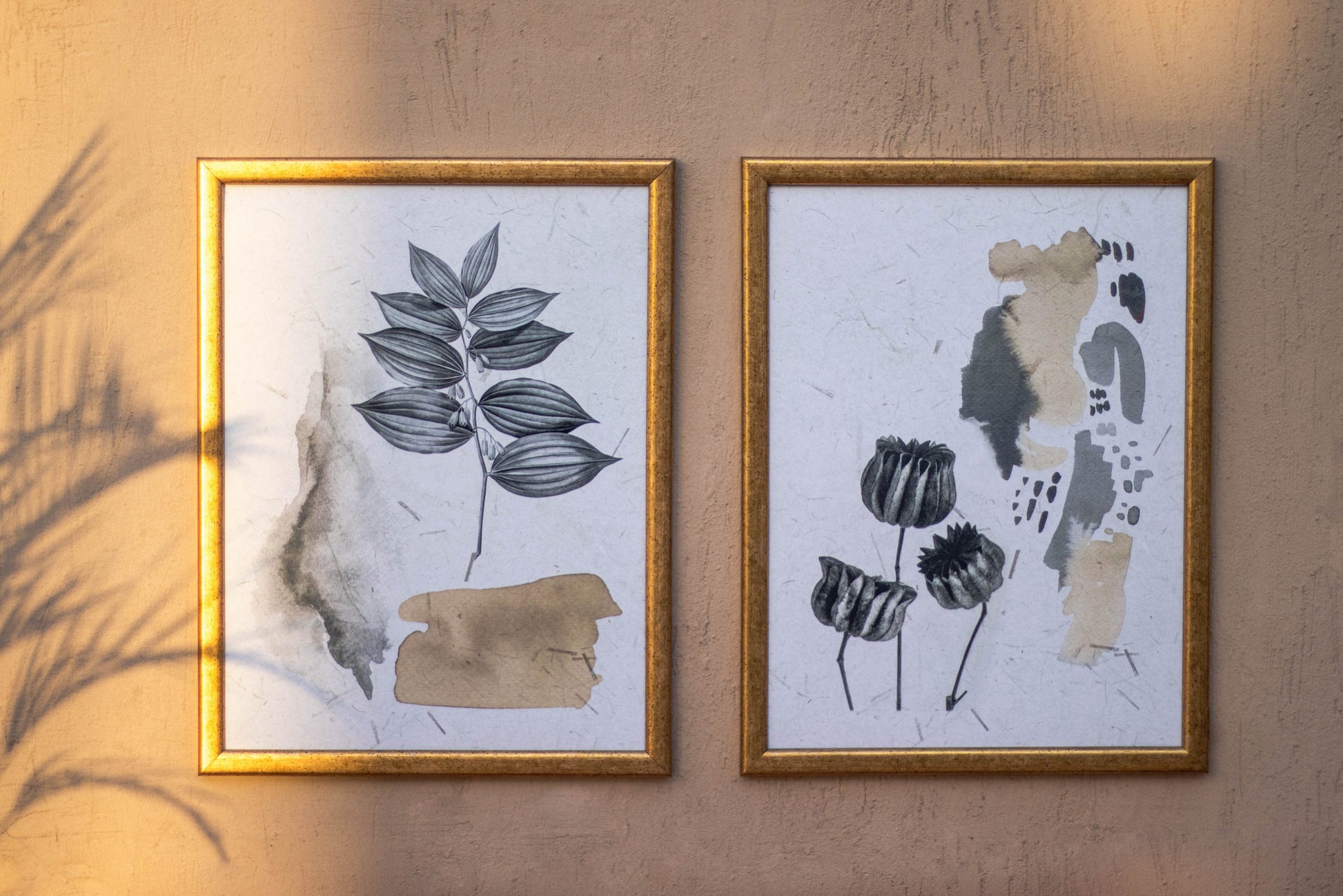 Add a touch of elegance with this set of 2 framed botanical prints, featuring black and grey leaf and floral sketches with soft watercolor accents. Perfect for modern, minimalist, or Scandinavian decor, each piece comes in a sleek gold frame to elevate any room.