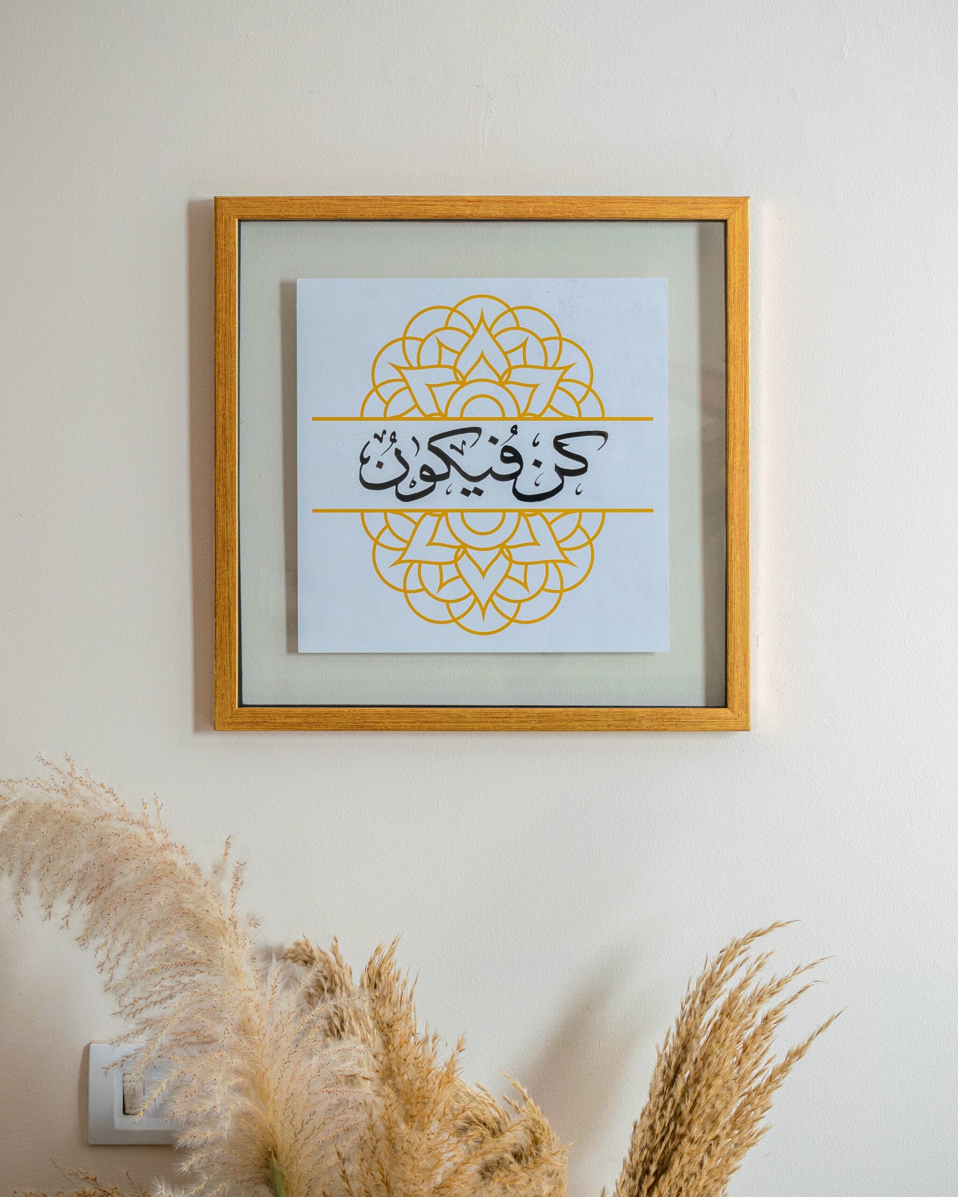 This powerful frame carries the phrase “Kun Fa Yakun”, meaning “Be, and it is”. The confident brushwork in black ink contrasts beautifully with the soft white texture of the paper, while luminous gold leaf accents create a sense of divine command and grace. A bold visual reminder of faith and trust.