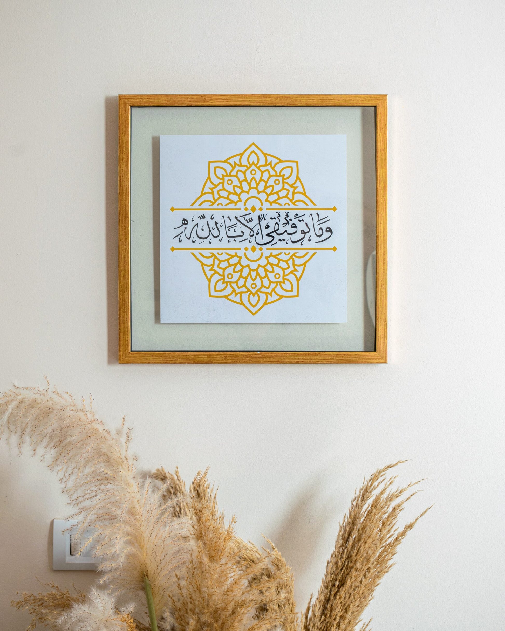 This elegant frame features the phrase “Wa ma tawfiqi illa billah”, meaning “My success is only by Allah.” The calligraphy is finely handwritten in black ink on softly textured white paper, with golden leaf embellishments that lend it both warmth and sophistication. A piece that speaks of humility and reliance on the Divine.