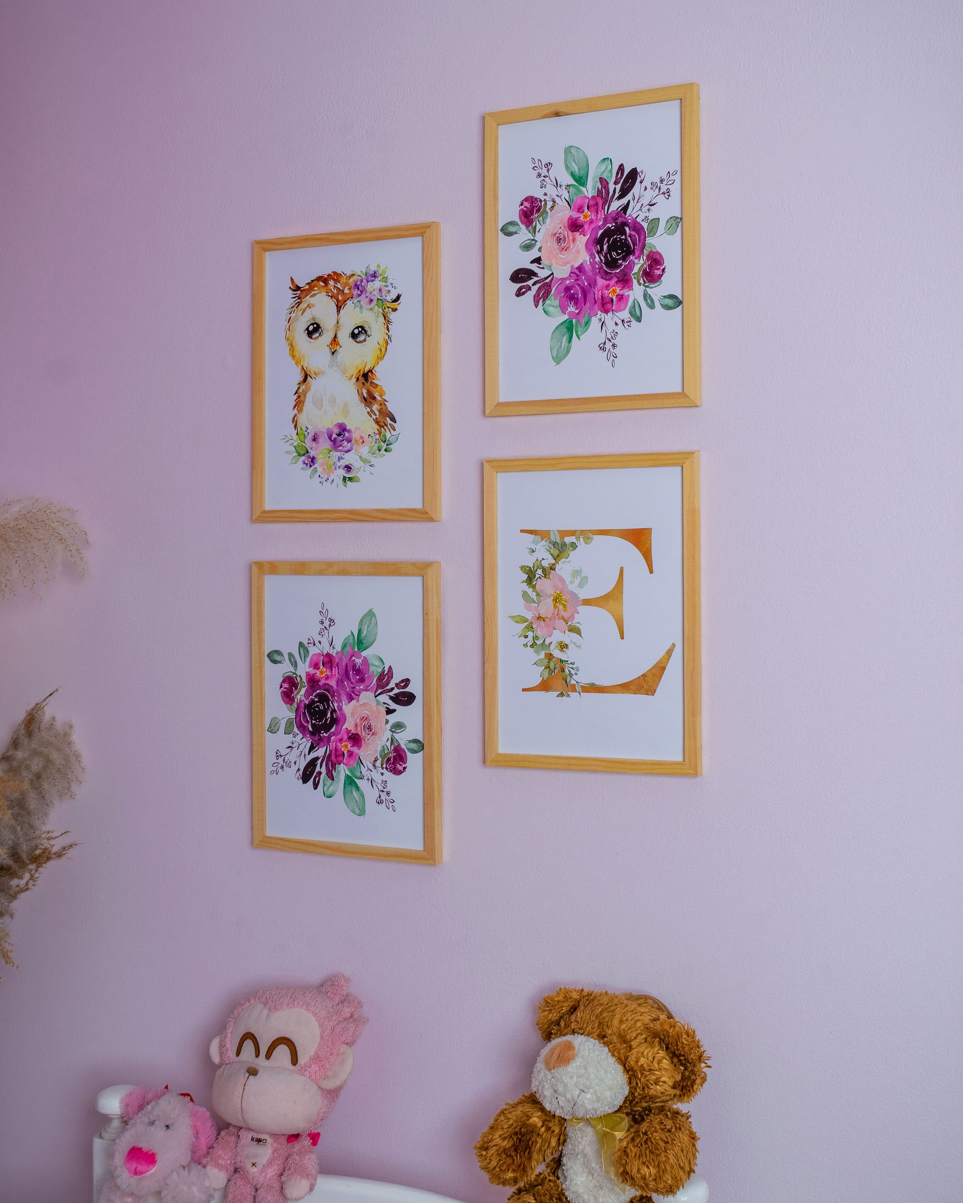 A personalized set of 4 frames for stylish kids’ rooms. Featuring floral-accented initials, this wall art is perfect for adding a meaningful and elegant touch to any space.