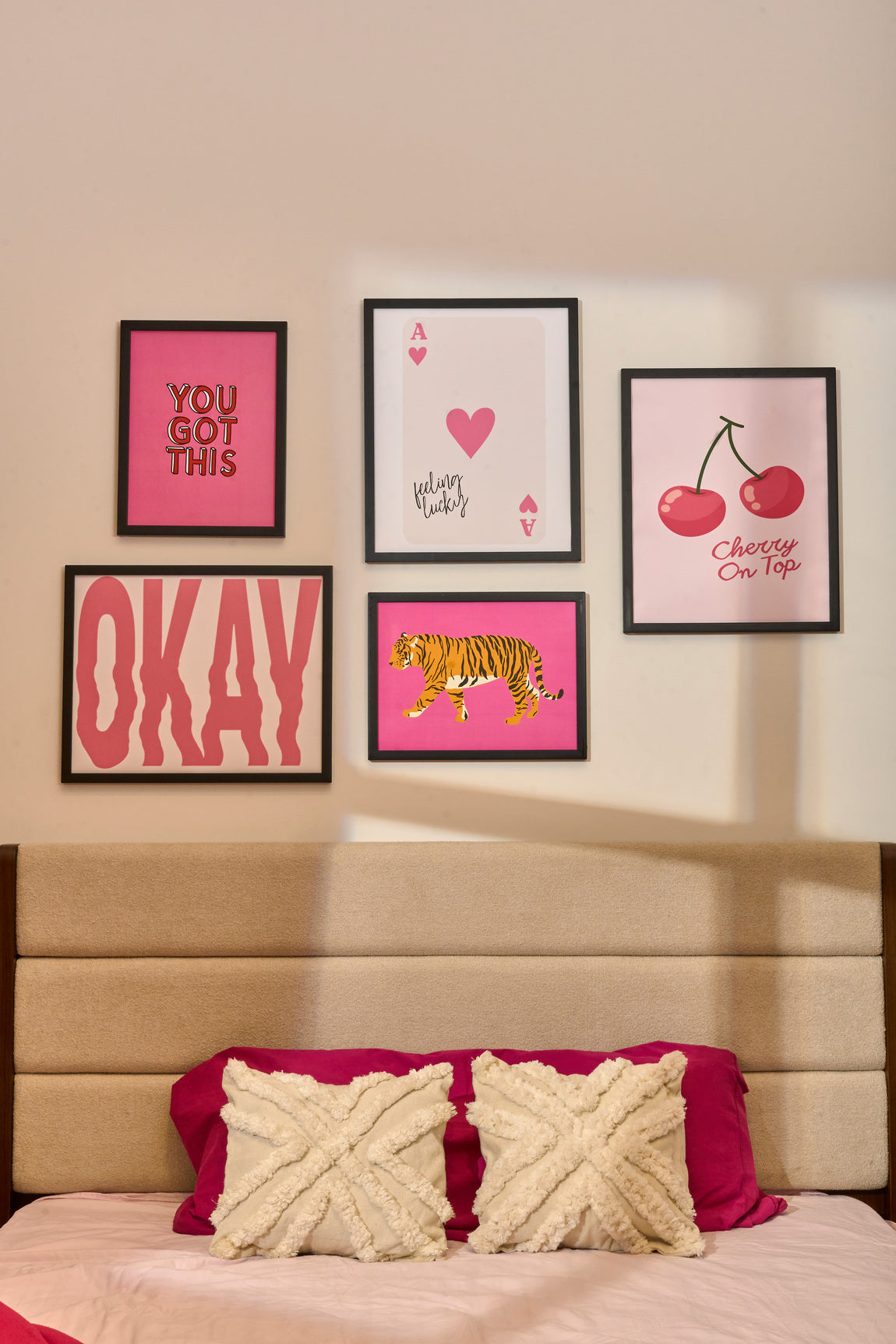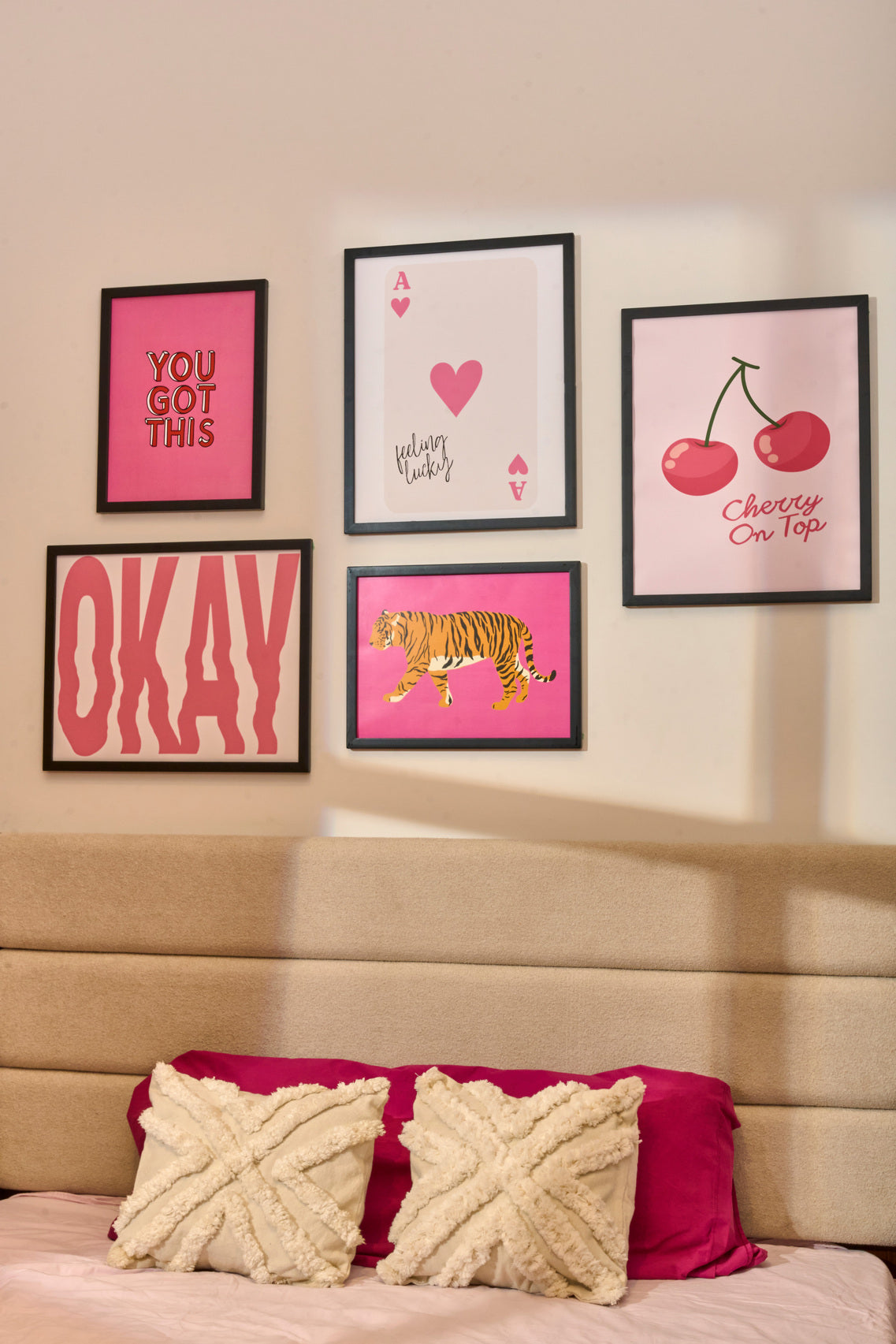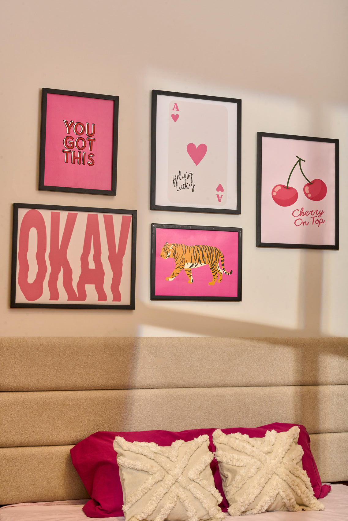 This bold and playful wall art set features five vibrant pink-themed framed prints with empowering quotes, whimsical illustrations, and eye-catching graphics like cherries, a tiger, and a lucky heart card. Perfect for teens, dorm rooms, or creative workspaces, this collection adds a fun, confident pop of personality to any space