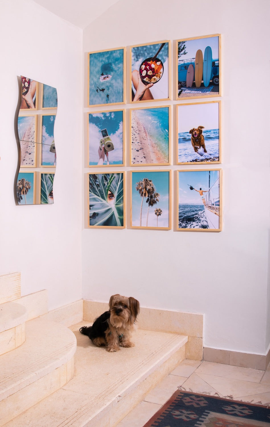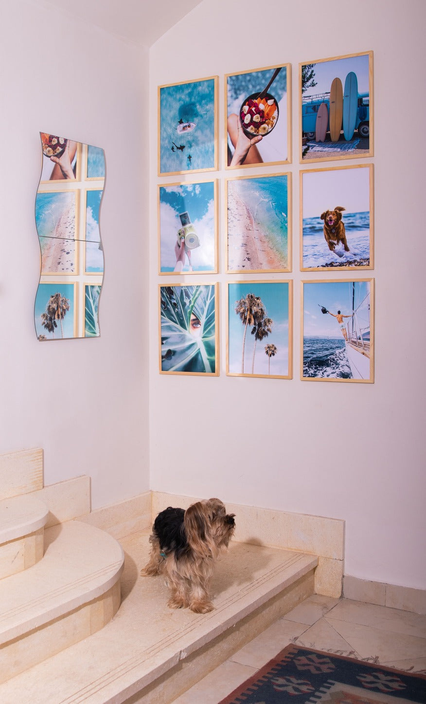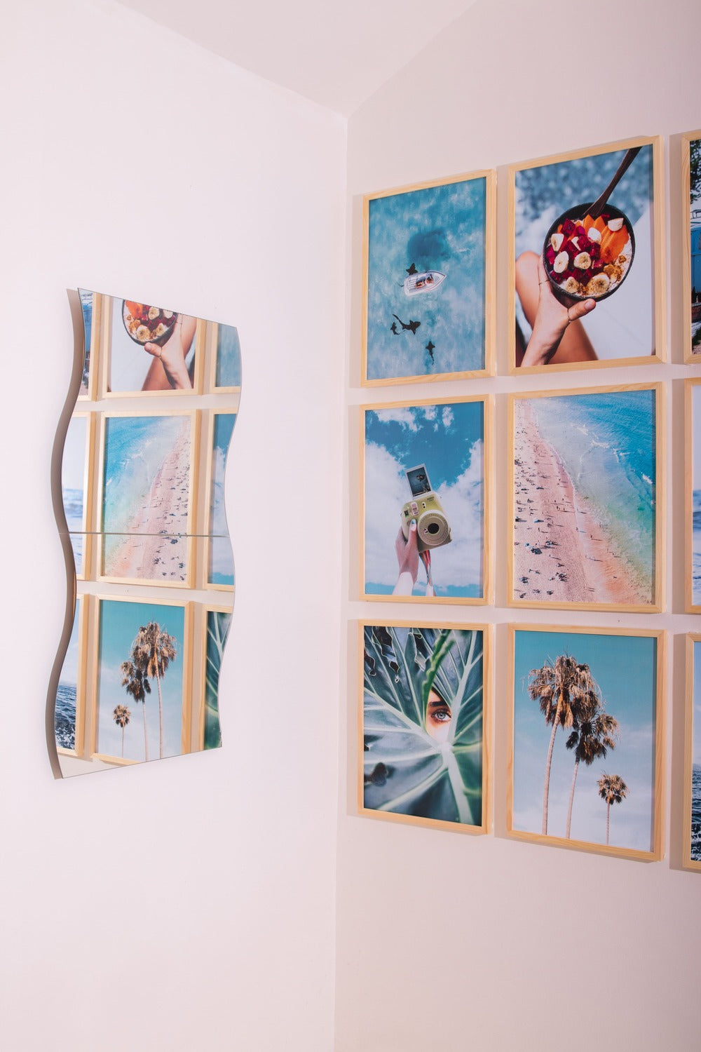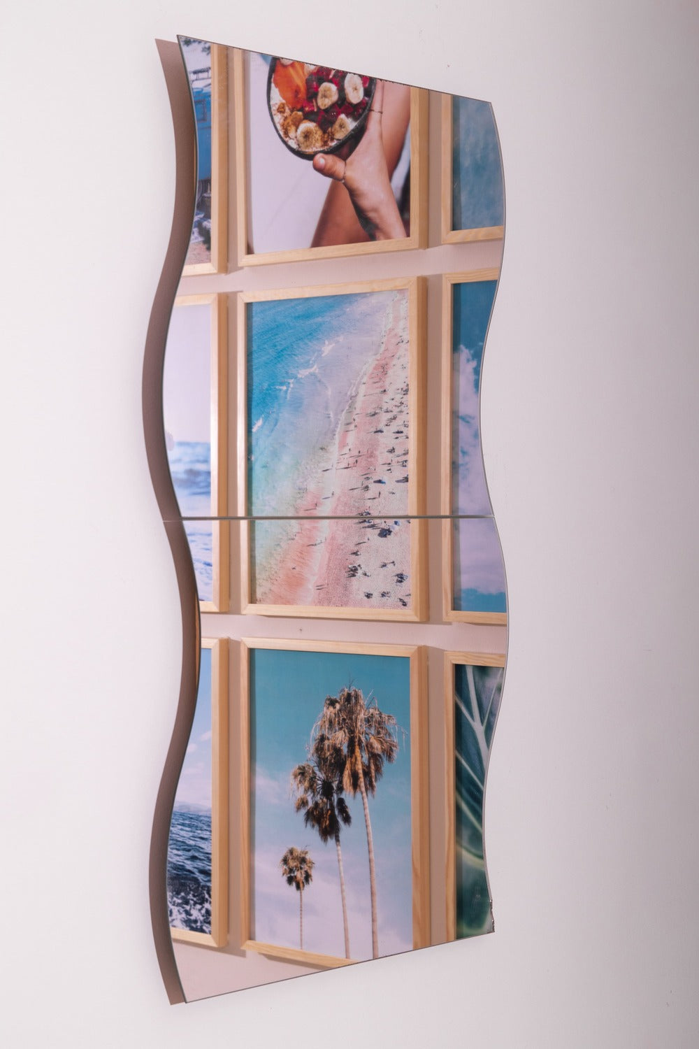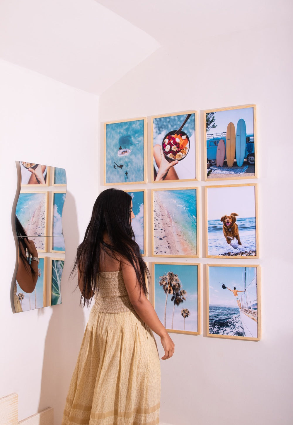 Vibrant summer photo wall art set of 9 frames featuring beach scenes, surfing, tropical vibes, and coastal lifestyle moments. Perfect for boho decor, beach house walls, or travel-inspired interiors. (Mirror not included)