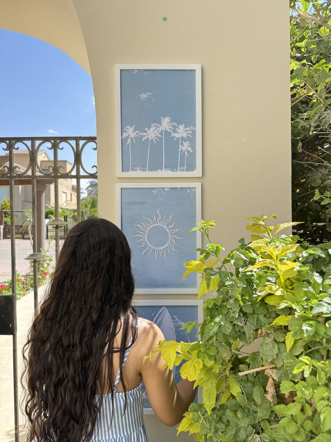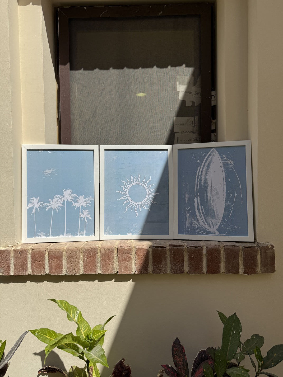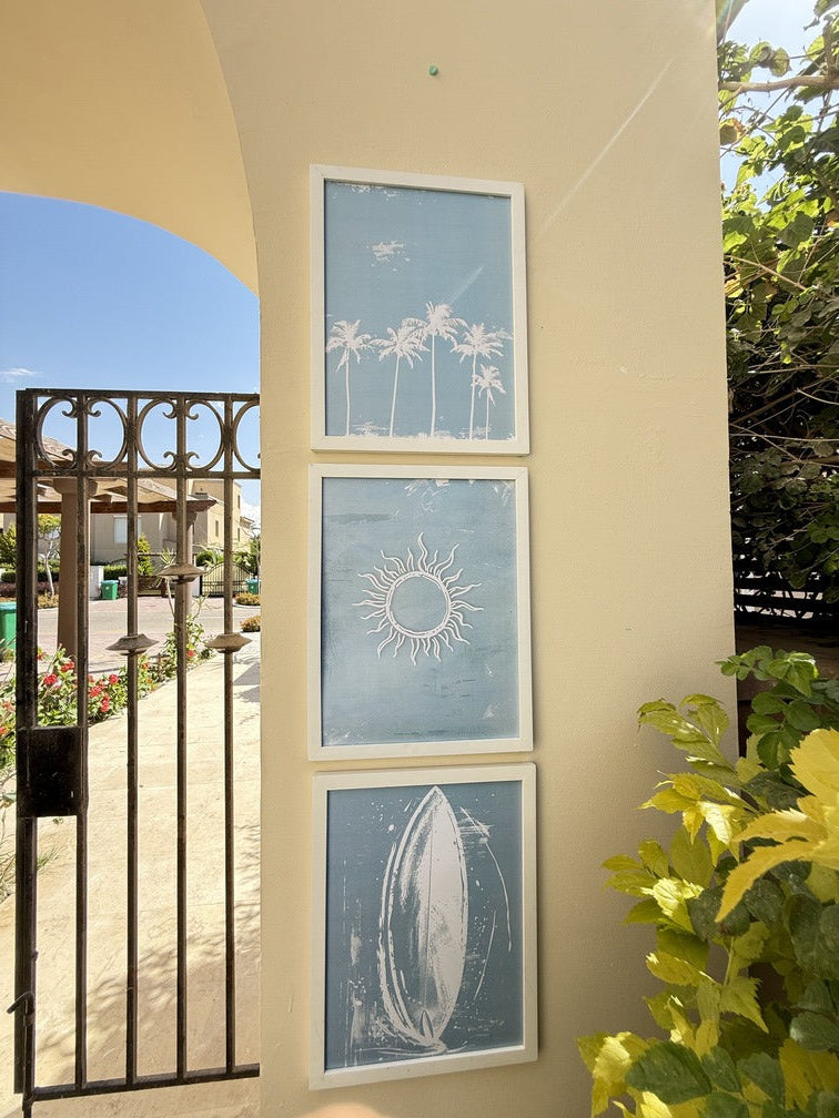 Elevate your space with this minimalist tropical wall art set in calming sky-blue tones. This framed trio is perfect for creating a laid-back beach vibe. Ideal for beach houses, or coastal-inspired rooms, this surf and summer-themed decor brings a refreshing and modern touch to your walls.